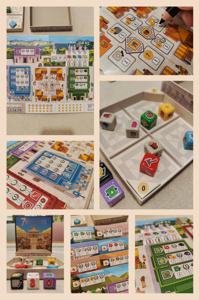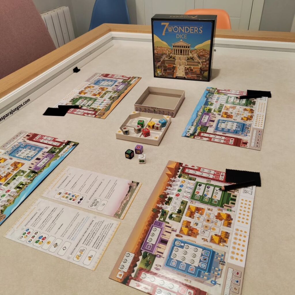 🎲 7 Wonders Dice es la nueva versión de este juego de civilizaciones. En cada turno, agitaremos los dados dentro de la caja, lo que los repartirá en secciones de distinto coste. Y entonces cada jugador elegiremos activar alguno de ellos, para tachar casillas en nuestro tablero personal.