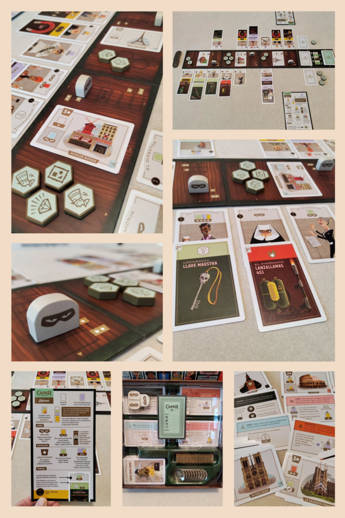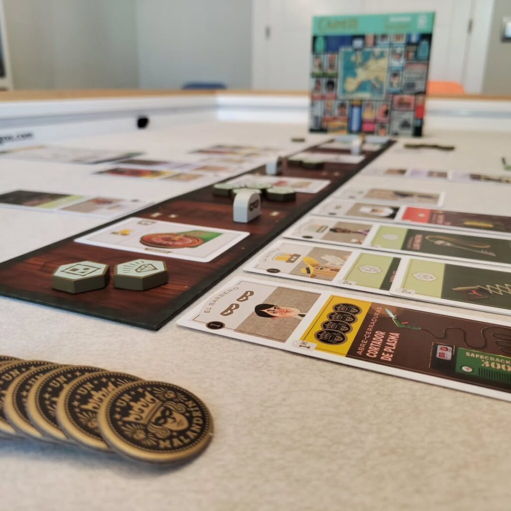 💬 Caper Europe hace una elegante propuesta para un juego de mayorías de 2 jugadores. De una manera muy simétrica (con un draft cerrado perfectamente equilibrado) y a la par completamente asimétrica (puesto que cada ladrón tiene un efecto diferente), consigue una tensión que se mantendrá hasta el final.