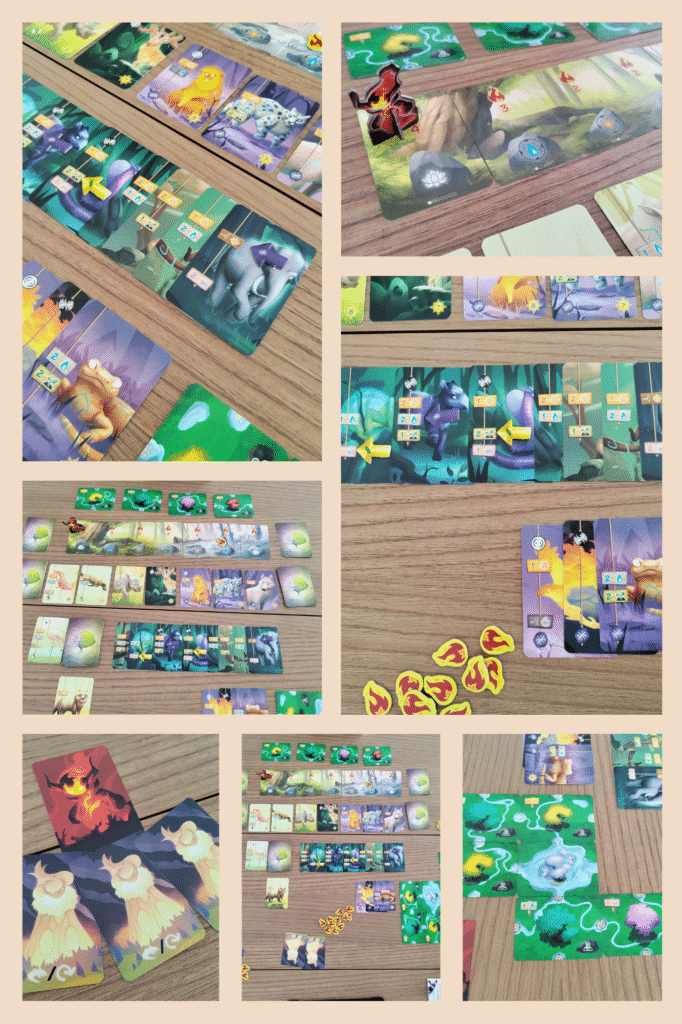 Cada una de las acciones está enfocada a un aspecto. Podremos extinguir fuegos (con 8 fichas ganamos), plantar árboles conectados por ríos (con una cuadrícula 3×3 ganamos), adquirir nuevas cartas propias o del rival (si todo el mercado es de nuestra facción ganamos) o hacer avanzar al Onibi, realizando a la vez acciones (si lo sacamos 2 veces por el lateral de nuestro rival ganamos).