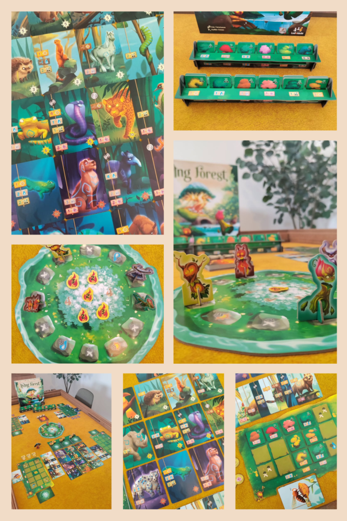En nuestro turno, sacaremos cartas de nuestro mazo hasta que queramos parar. Si no hemos superado el límite de iconos de espíritu solitario, podremos hacer dos acciones, y de lo contrario solo una. Una de estas acciones nos permitirá conseguir nuevas cartas de espíritu. Otra servirá para apagar los fuegos que aparecen cuando lo hacemos. Con otra, plantaremos árboles que nos conseguirán efectos permanentes. Y con la última, giraremos en el círculo del claro para interactuar con otros jugadores.