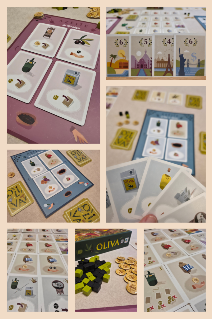 Las acciones nos servirán para recolectar olivas, convertirlas en aceite y venderlo, entre otras cosas. Y al hacerlo, iremos consiguiendo cartas de puntuación o cartas con banderas de países, que, cuando juguemos en turnos posteriores, de nuevo serán más potentes si ese icono está presente. De la misma forma que otras cartas que podremos comprar con dinero.
