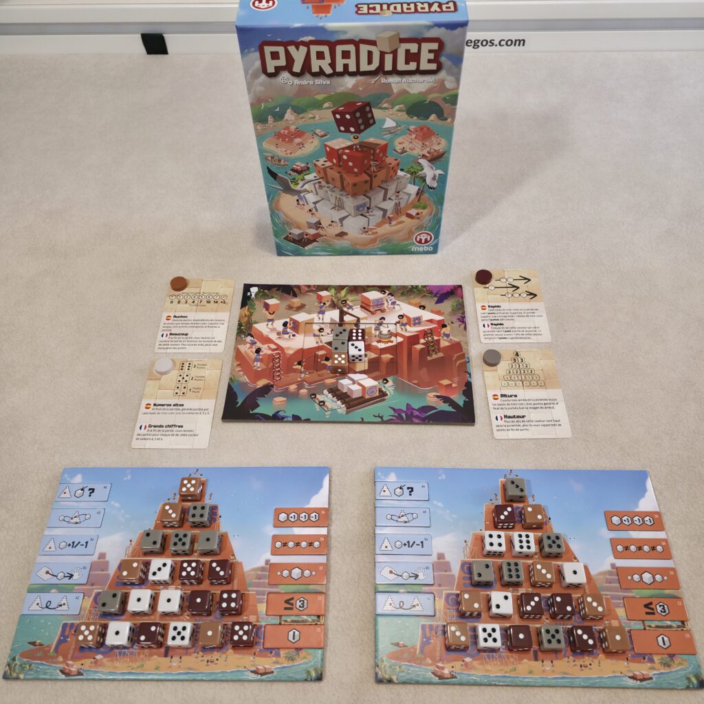 💬 Pyradice es un juego con una mecánica sencilla, pero que presenta un puzle interesante. Los criterios de puntuación de las filas y de los colores de dados son bastante distintos, por lo que hay momentos en los que claramente hay dados más deseables que otros, y esto hace que la pelea táctica por llevárselos sea tensa. Vienen más losetas y cartas de las que se utilizan en una partida, por lo que tiene cierta rejugabilidad, aunque no es su punto más fuerte. Lo positivo es que al ser un juego tan directo, las partidas vuelan y puedes encajarlas en cualquier tarde sin necesitar mucho tiempo.
